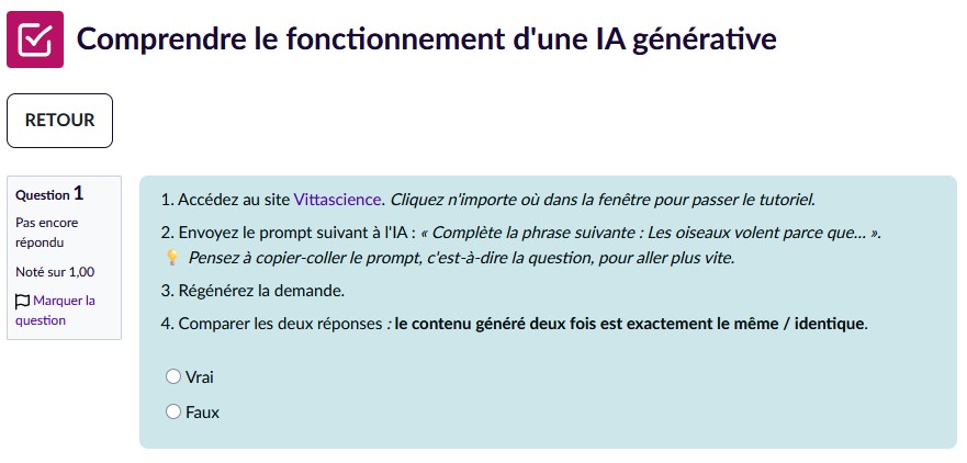 Pour l’année 2025-2026, il a été décidé de renouveler le parcours pour toutes les classes de seconde et de le proposer plus tôt dans l’année (avant la publication du cadrage concernant les parcours PIX dédié à l’intelligence artificielle obligatoires pour les élèves de 4ème et de 2nde). Avec l’évolution des outils, mais surtout des usages et du niveau de maîtrise des élèves, il est nécessaire d’adapter régulièrement les scénarios pédagogiques autour de l’intelligence artificielle. Aussi, la 2e séance de la séquence a été intégralement revue pour se concentrer sur le fonctionnement concret des IA à travers des exercices pratiques. Le format choisi est un parcours Éléa qui permet à chaque élève d’avancer à son rythme et de vérifier instantanément leurs réponses.