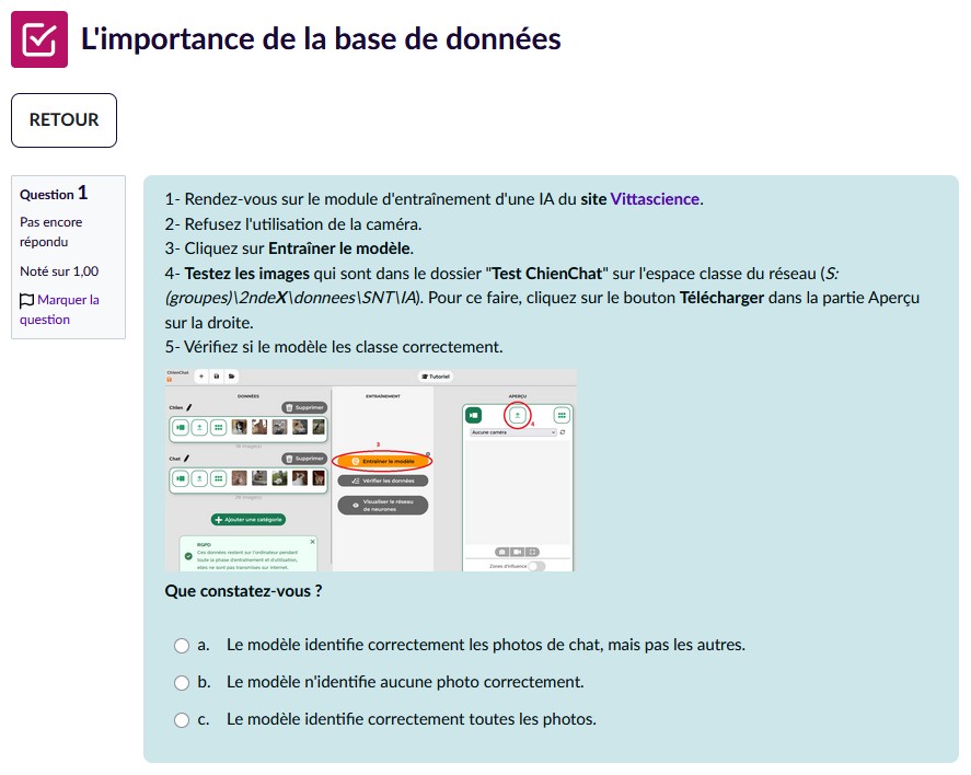 La plupart des activités mobilisent deux plateformes d’IA sans compte : Vittascience et ComparIA. La première permet de s’initier à l’intelligence artificielle en rendant visible le fonctionnement probabilisme ou en entraînant des modèles de reconnaissance d’image, tandis que la deuxième permet de comparer à l’aveugle deux modèles d’agents conversationnels et de prendre conscience de l’impact environnemental des discussions avec les modèles.