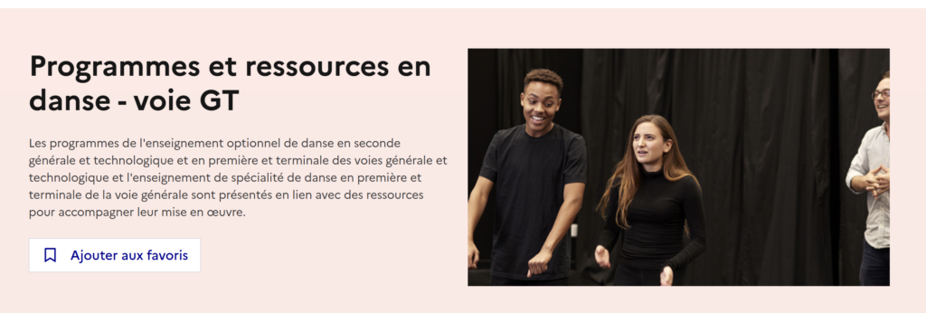 Retrouvez les programmes et ressources autour de l’enseignement de la danse en lycée général et technologique sur la Page Eduscol (cliquer sur l’image pour accéder à la page)