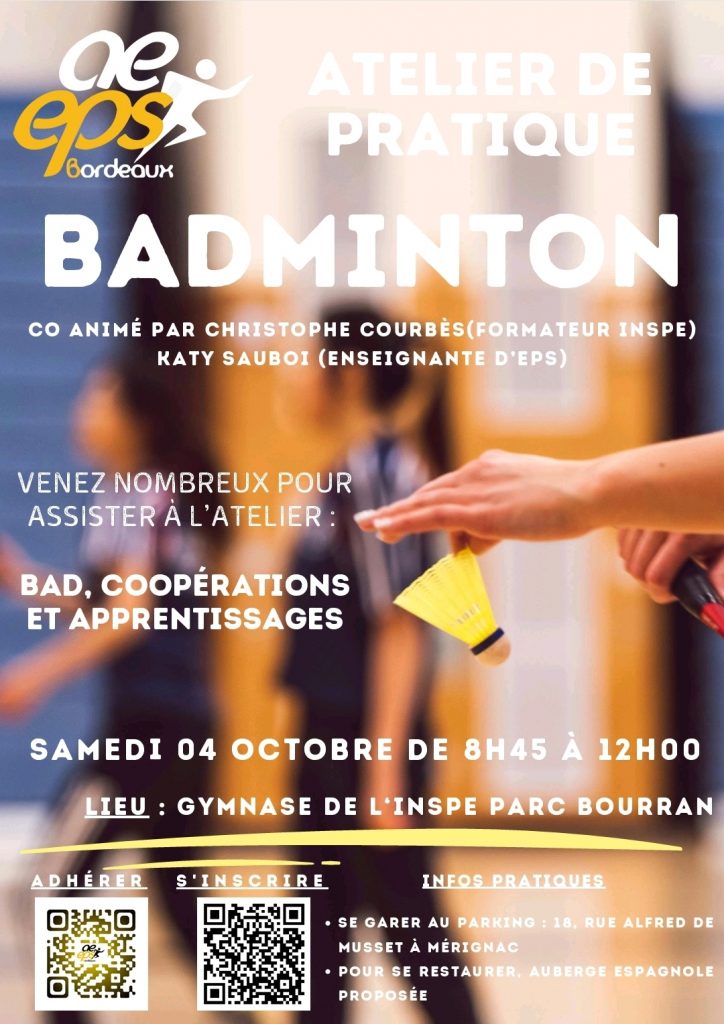 L’AE-EPS Bordeaux organise un atelier de pratique BADMINTON le samedi 4 décembre 2024 de 9h à 12h au gymnase de l’INSPE (situé dans le parc Bourran de Mérignac) animé par Katy Sauboi, professeure agrégée d’EPS et Christophe Courbes, formateur INSPÉ.