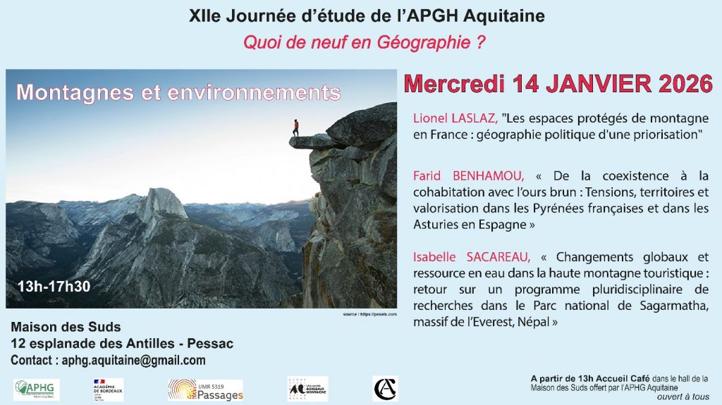 L’APHG Aquitaine vous invite à participer à sa journée quoi de neuf en géo qui aura lieu le mercredi 14 janvier prochain à partir de 13h30. Le thème de la journée sera Montagnes et environnements géographiques dans le monde.