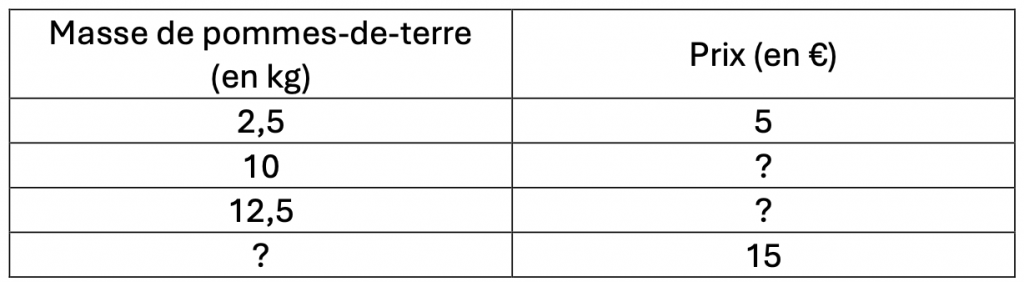 Ou alors quand je prends 12,5 kg, j’en prends 5 fois plus que quand j’en prends 2,5 kg. Donc le prix est aussi 5 fois plus grand : 25 €.