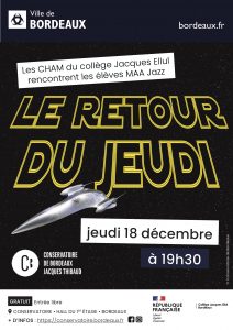 Comme à chaque veille de vacances, le rendez-vous du jeudi réunira les élèves de 6ᵉ–5ᵉ et de 4ᵉ CHAM du collège Jacques Ellul de Bordeaux, ainsi que les élèves de 1ʳᵉ en aménagement d’horaires du lycée François Mauriac (dans le cadre de la poursuite de la CHAM). Ils se produiront ce jeudi soir au Conservatoire.