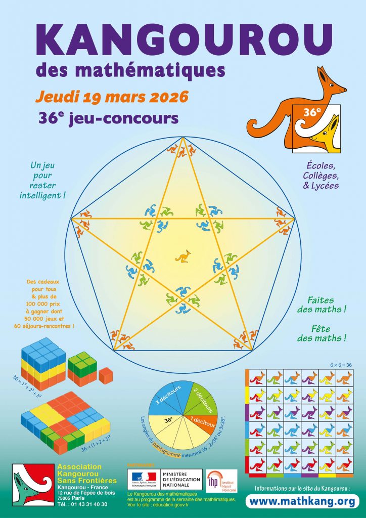 Kangourou des mathématiques, un jeu-concours composé de 24 questions à choix multiples, proposées le même jour dans tous les établissements participants. D’envergure internationale, il réunit aujourd’hui plus de 6 millions de participants en Europe et dans le monde.