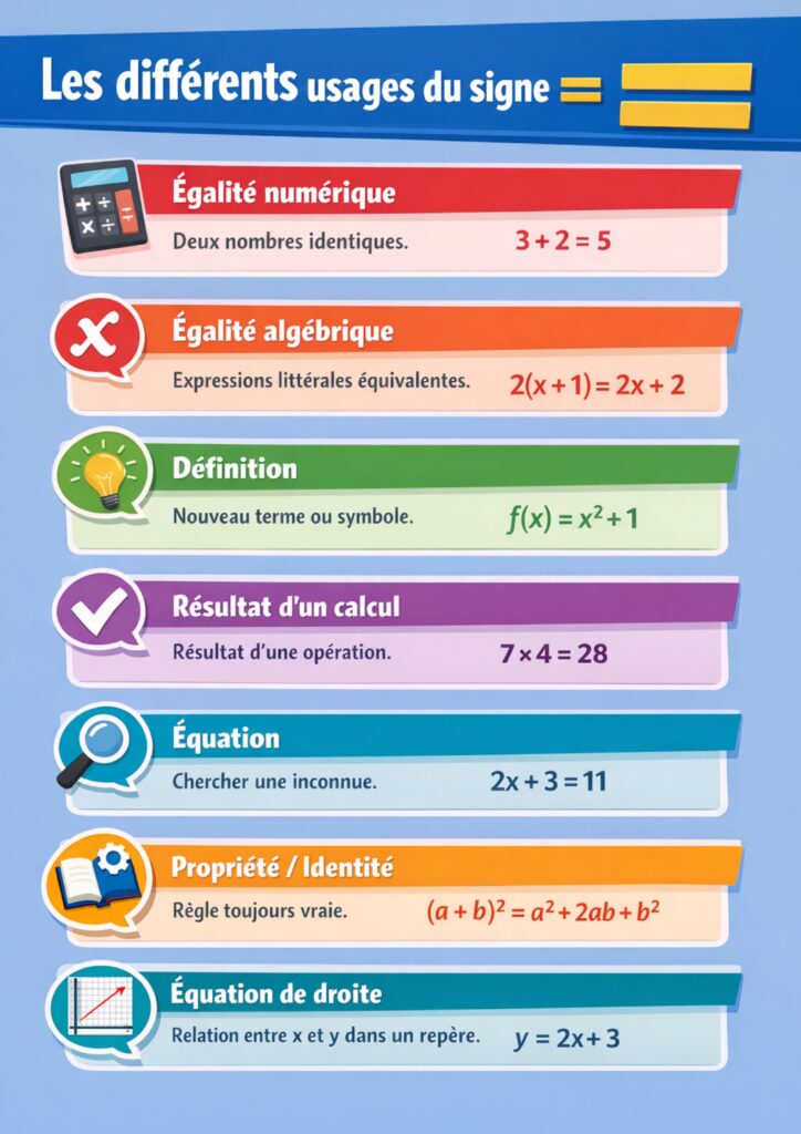 Cette affiche est également téléchargeable, offrant la possibilité de la consulter ou de l’utiliser comme support pédagogique en classe. Une belle occasion de découvrir la richesse et la diversité du signe égal dans les mathématiques !