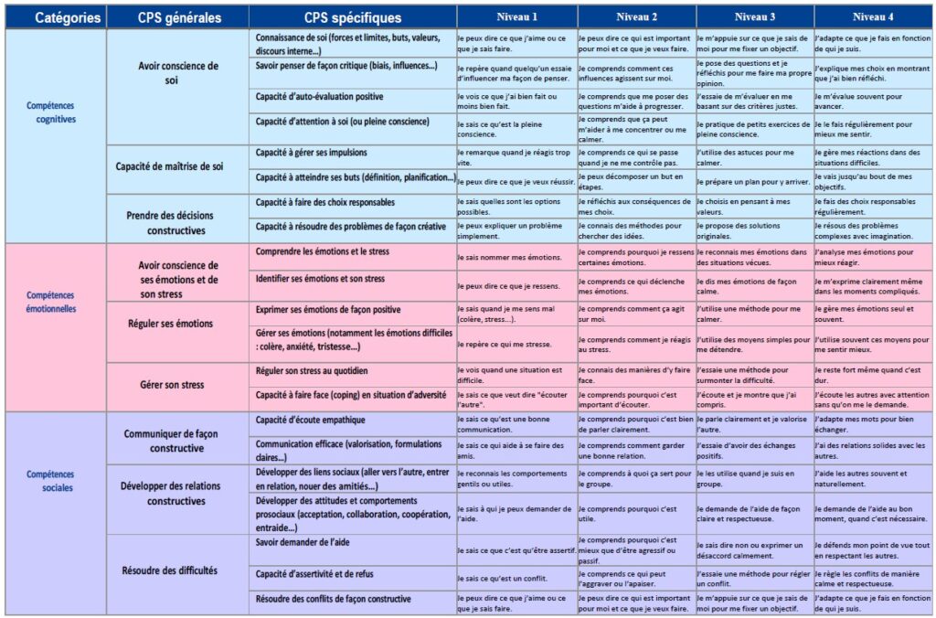 https://eduscol.education.gouv.fr/4677/developper-les-competences-psychosociales-chez-les-eleves - Classification détaillée des CPS (2022)