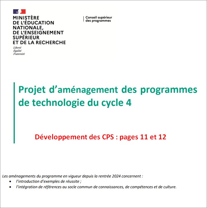 https://www.santepubliquefrance.fr/docs/les-competences-psychosociales-un-referentiel-pour-un-deploiement-aupres-des-enfants-et-des-jeunes.-synthese-de-l-etat-des-connaissances-scientif - Projet d’aménagement des programmes de Technologie – Cycle 4 (juin 2025)