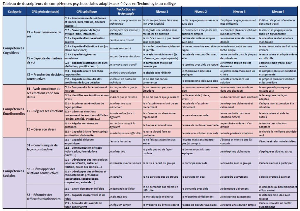 Dans le cadre de l’enseignement de la Technologie au collège, les CPS sont mobilisées de manière transversale et intégrée aux apprentissages disciplinaires. Elles contribuent à la réussite scolaire, au bien-être des élèves et à l’amélioration du climat scolaire.